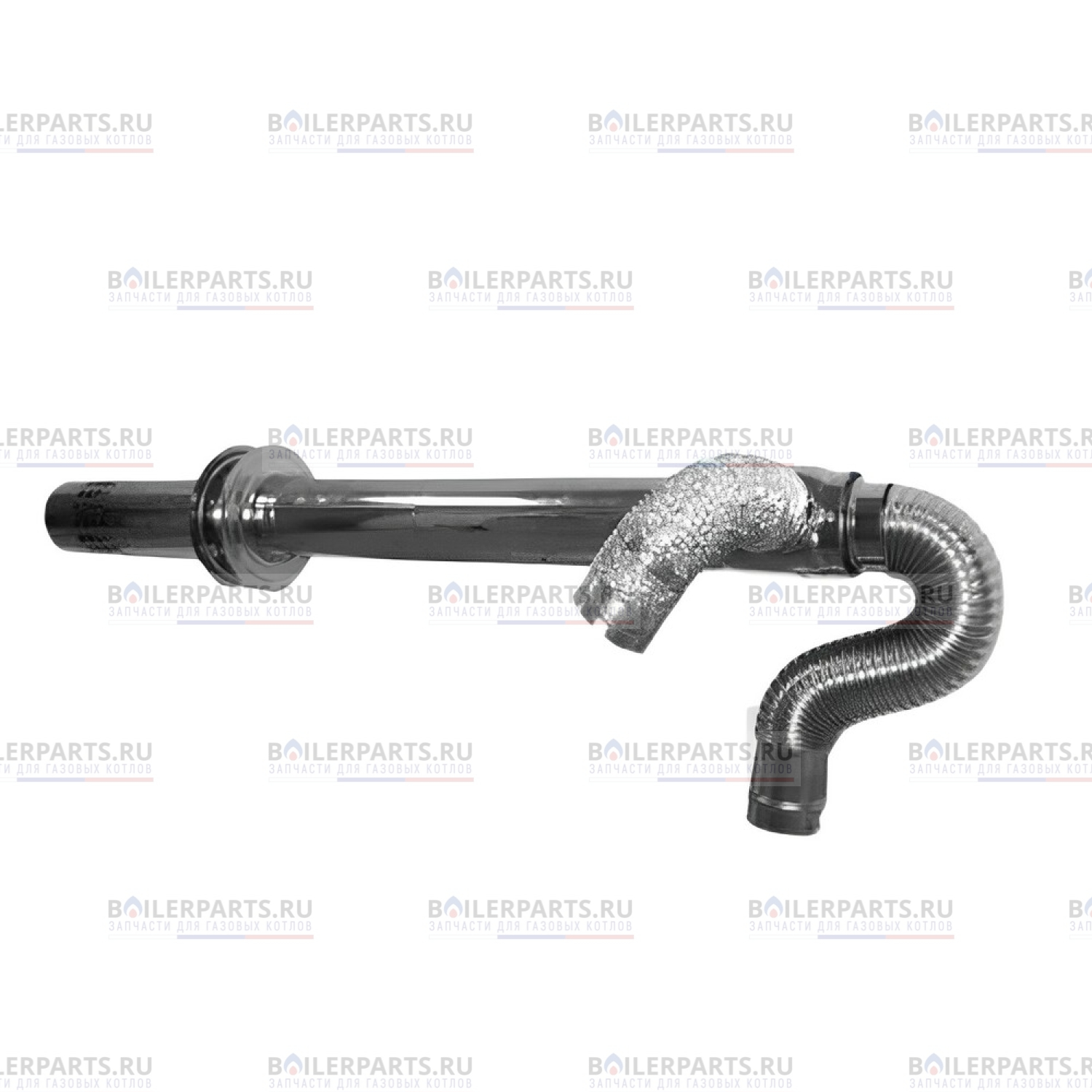 Данный дымоход предназначен для турбированного (принудительного) вывода отработанных выхлопных газов из котла на улицу горизонтально через стену толщиной до 80 см и для забора с улицы подогреваемого воздуха. Изготовлен дымоход из высококачественной нержавеющей стали, сваренной в жесткую конструкцию «труба в трубе». Внутренняя труба диаметром 75\100 мм служит для вывода выхлопных газов из котла и для подогрева межтрубного пространства между внешней и внутренней трубой. Внешняя труба диаметром 100 мм служит для забора воздуха с улицы. В комплект дымохода входит стальная коаксиальная труба, стальной соединительный элемент S-образной формы, алюминиевая гофра для забора воздуха и крепежные диски для монтажа трубы через стену.