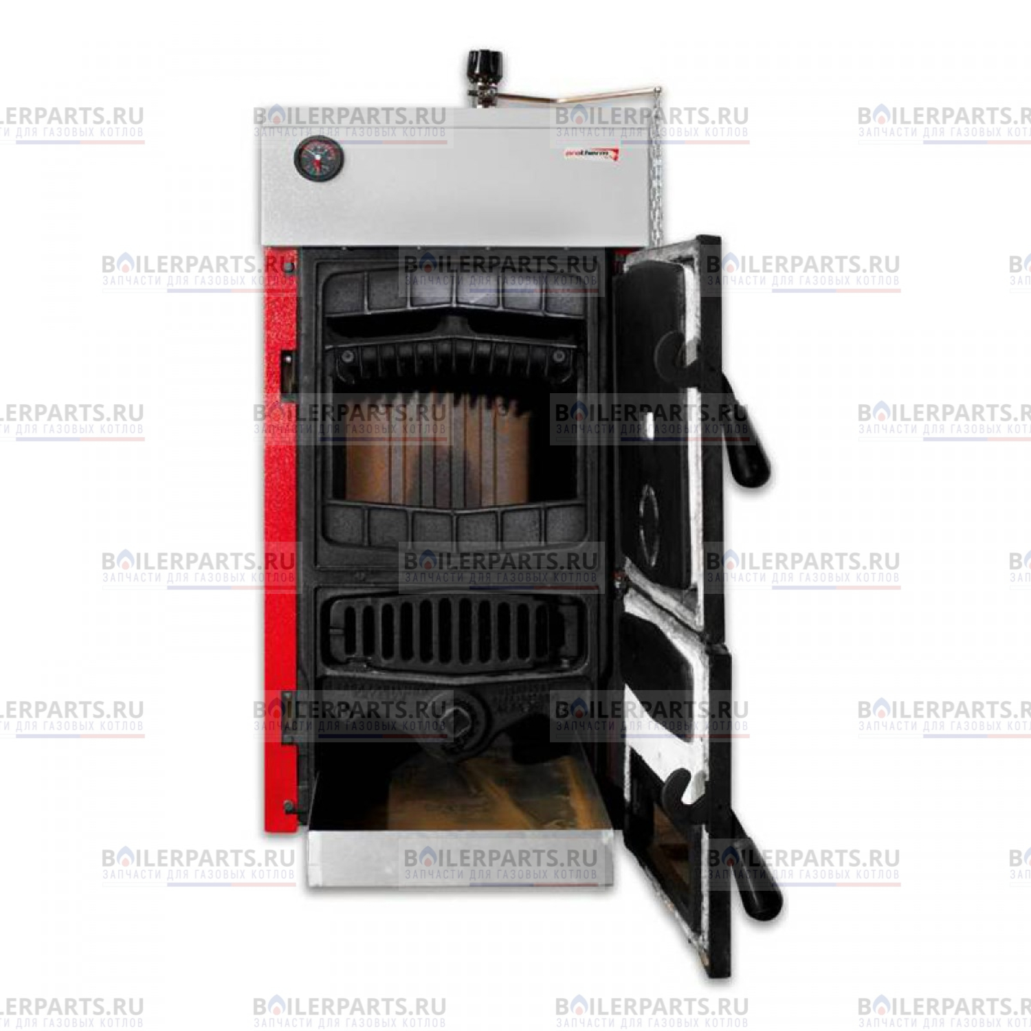 Твердотопливный котел Protherm Бобёр 30DLO одноконтурный для напольного монтажа с открытой камерой сгорания и чугунным теплообменником, использующий для работы дрова (влажность до 20%) или уголь (зернистость не менее 40 мм). Тепловая мощность 23 кВт позволяет обеспечить отоплением жилых и коммерческих помещений площадью до 172 м2. Котел энергонезависем и не требует подключения к электросети 220 В. Предназначен для работы в системах с естественной циркуляцией теплоносителя. Термомеханическим регулятором прямого действия автоматические регулируется мощность котла. Двухходовой литой чугунный теплообменник равномерно распределяет температуру в отдельных секциях. Оригинальная конструкция камеры сгорания увеличивает площадь нагрева теплоносителя. Охладительный контур препятствует повышению температуры теплоносителя в котле свыше 100°С. Производителем предусмотрена возможность работы вместе с газовыми или электрическими котлами для обеспечения также и постоянного горячего водоснабжения. Может использоваться как основной или резервный источник тепла в отопительных системах.