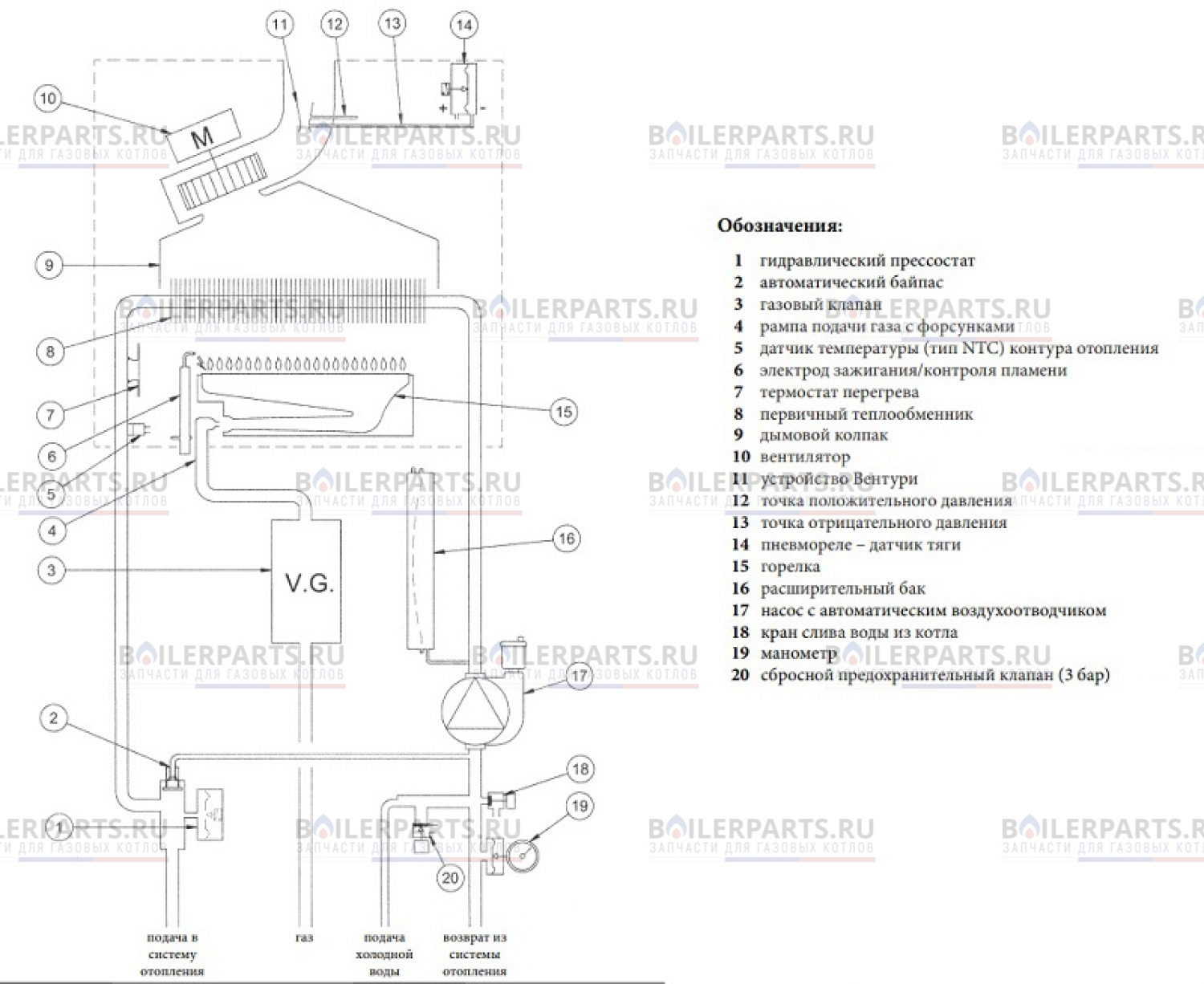 - предохранительный клапан в контуре отопления (3 бар);