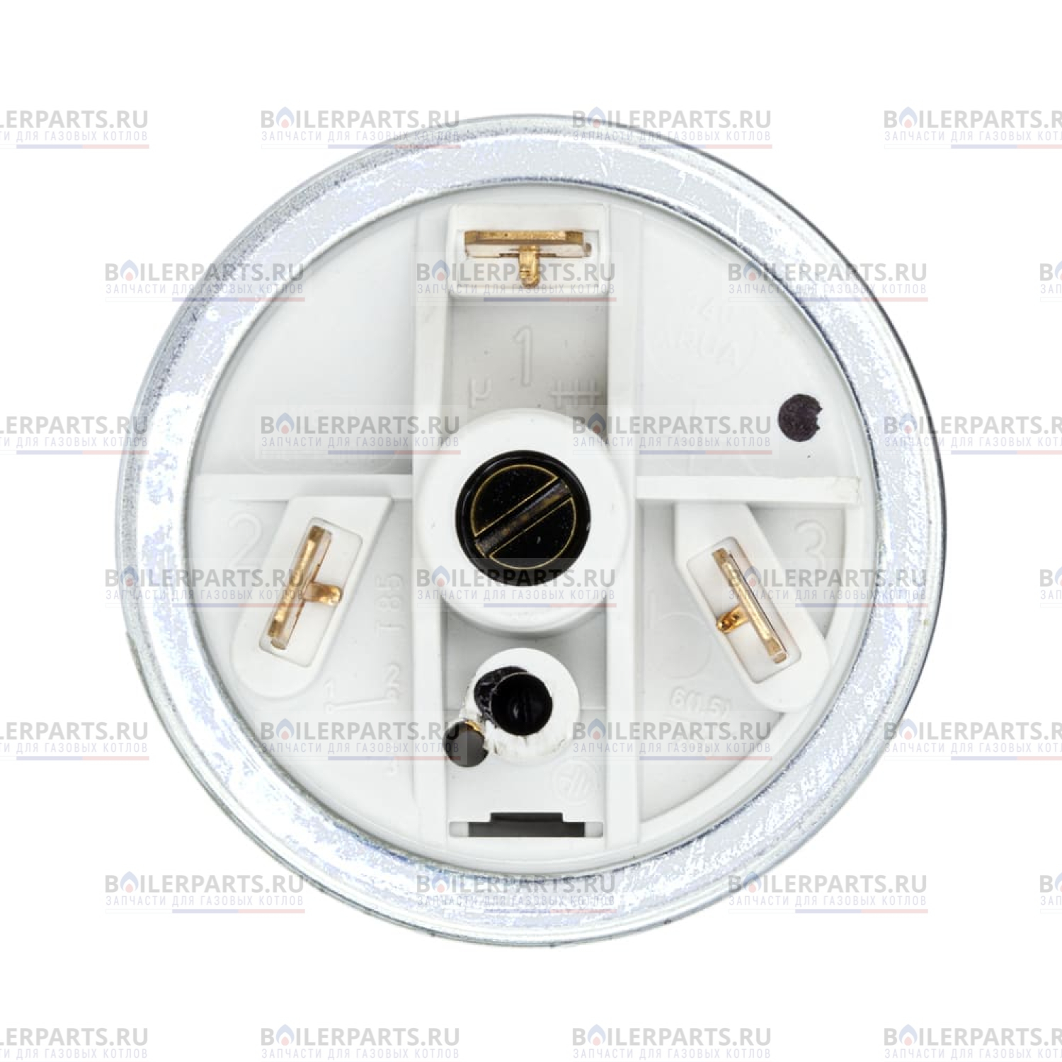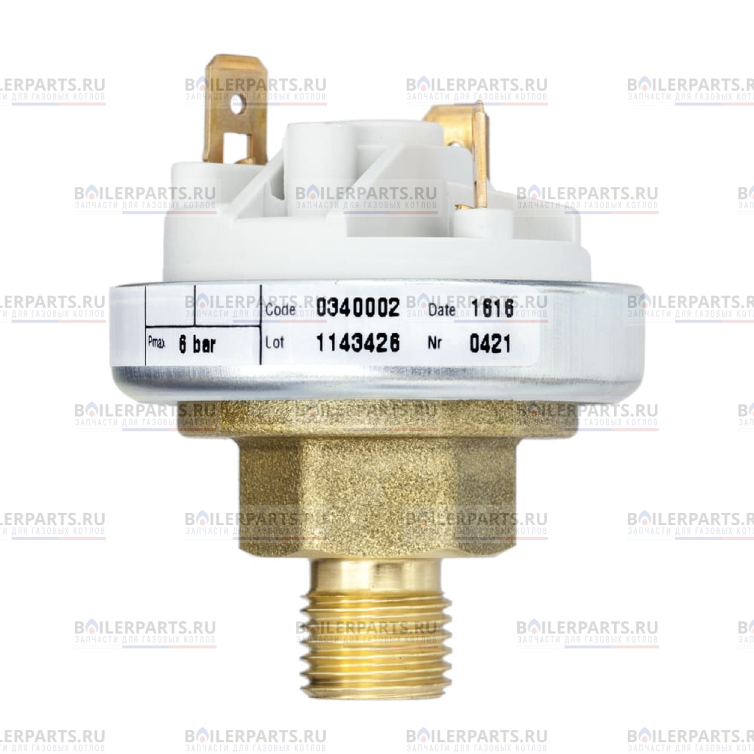 Прессостат - это датчик фиксирующий требуемый минимальный уровень давления теплоносителя в отопительной системе. При получение прессостатом сигнала о снижение давления меньше 0,5 бар, происходит разъединение контактов реле. Затем управляющая плата в аварийном режиме отключает котел BAXI.