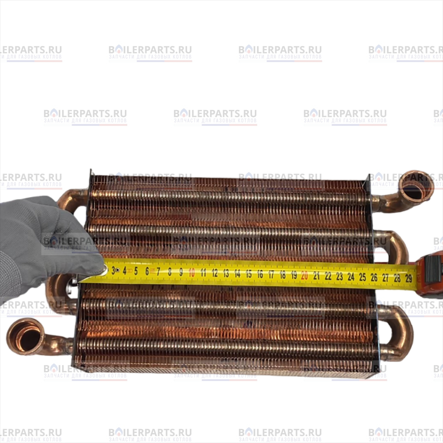 Теплообменник на обогрев отопительного контура представляет собой змеевик с пятью, диагонально расположенными трубками с множеством тонких пластин. Патрубки входа и выхода теплоносителя фиксируются скобами и скомпонованы по диагонали.