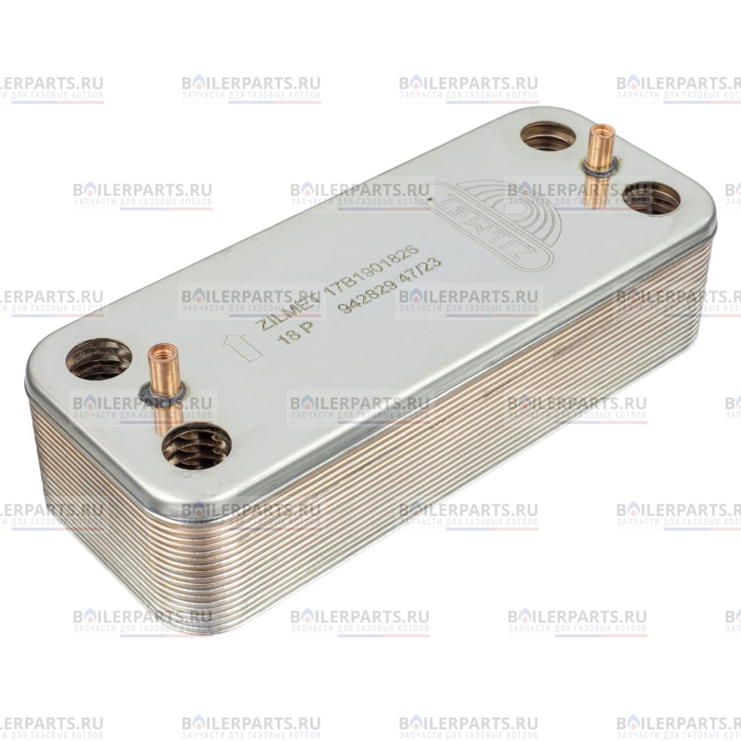 Теплообменник предназначен для приготовления горячей воды. В ней происходит теплопередача от теплоносителя первичного теплообменника. Так же его называют теплообменником ГВС. Представляет собой множество соединенных между собой пластин.