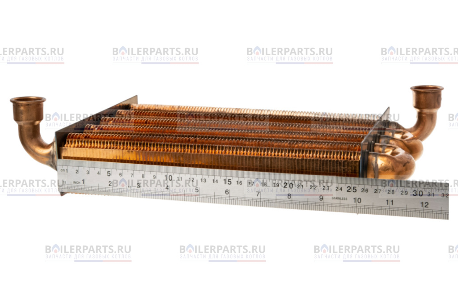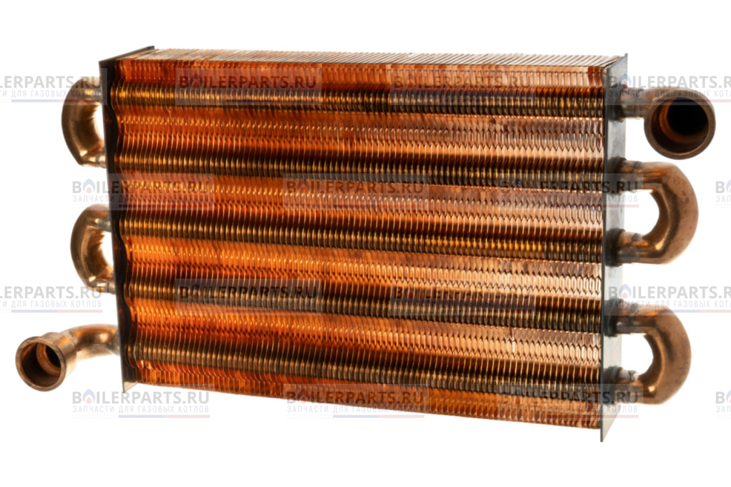 Теплообменник на обогрев отопительного контура представляет собой змеевик с пятью, диагонально расположенными трубками с множеством тонких пластин. Патрубки входа и выхода теплоносителя фиксируются скобами и скомпонованы по диагонали.
