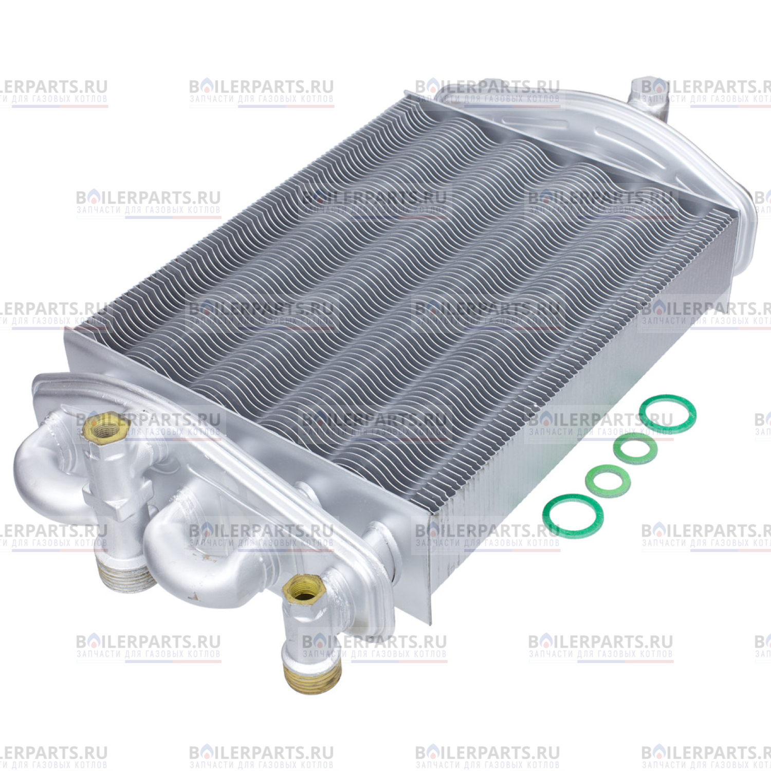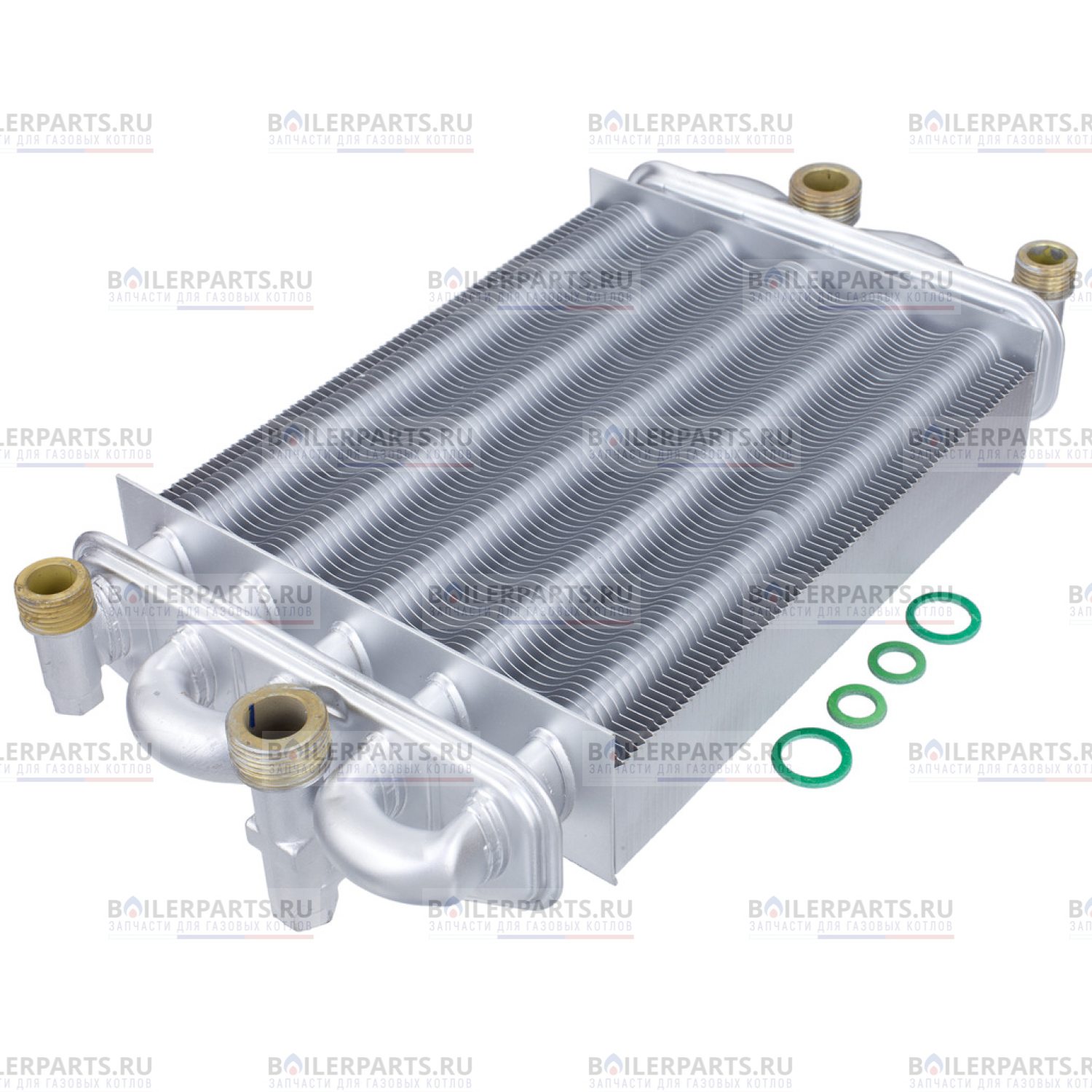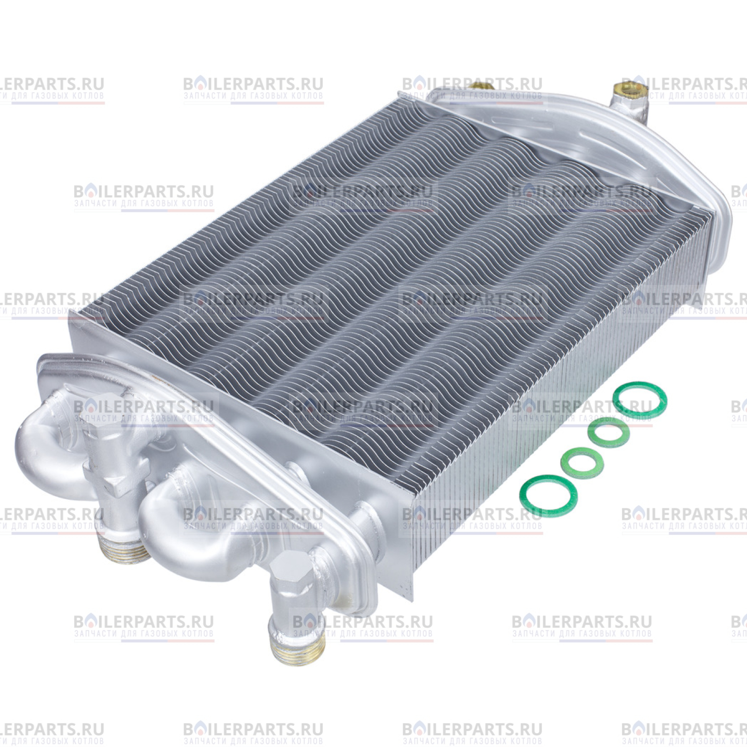 Конструктивно теплообменник представляет собой 5 медных трубок, что собраны в два коллектора: коллектор отопления и коллектор горячей воды. Трубки отопления по контуру подключены последовательно, по горячей воде - параллельно, что позволяет получить максимальную производительность в режиме приготовления горячей воды. Для лучшего теплообмена трубки имеют оребрения из медных пластинок, окрашенных защитным слоем силиконового покрытия, что предохраняет теплообменник от коррозии. При работе данного теплообменника в режиме гвс, проток воды контура отопления прекращается, и тепло передается через прослойку стоячей воды от дымовых газов к воде контура горячего водоснабжения.