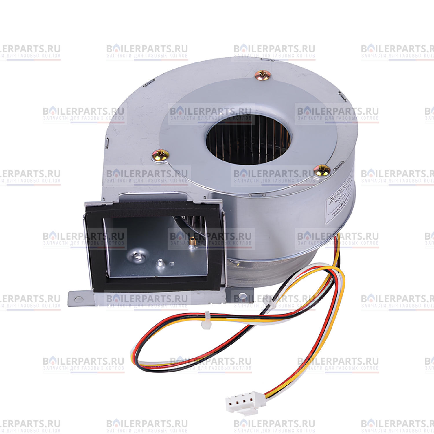 Вентилятор предназначен для принудительного отвода продуктов сгорания в котлах с закрытой камерой сгорания. Устанавливается вентилятор на выходе продуктов сгорания и имеет две скорости. Вентилятор имеет регулируемую частоту вращения, вследствие чего при работе подача воздуха на пониженных оборотах является наиболее экономичной. Вентилятор осуществляет подачу воздуха на горелку, для изготовления газо-воздушной смеси. За счет изменяемого числа оборотов, достигается высокая глубина модуляции горения. Из вентилятора выходят провода для подключения к блоку управления.
