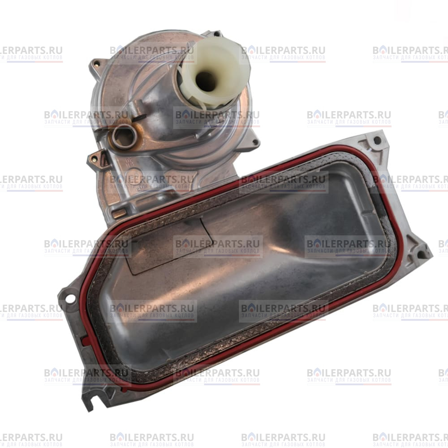 Вентилятор расположен над первичным теплообменником в верхней части камеры сгорания и установлен на подаче воздуха в камеру сгорания.